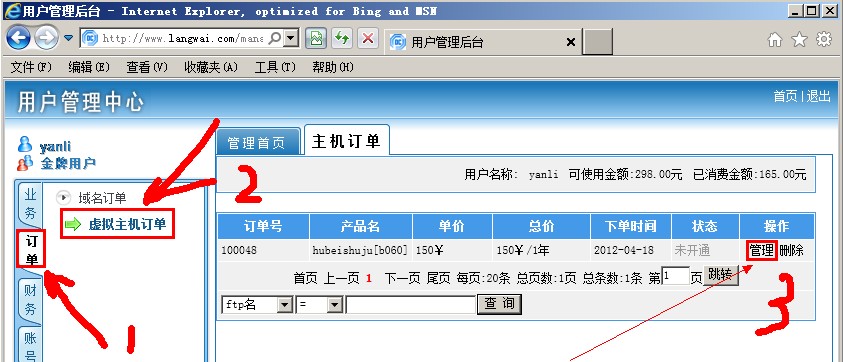 会员用户管理中心 在左侧导航 【订单】-【虚拟主机订单】-【管理】-【立即注册】