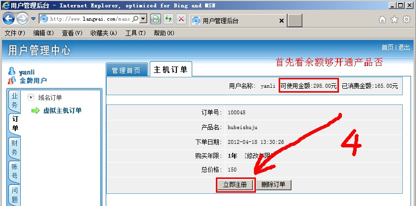 前提:你已经提交过了域名注册订单(如何提交?),空间购买订单(如何提交?)