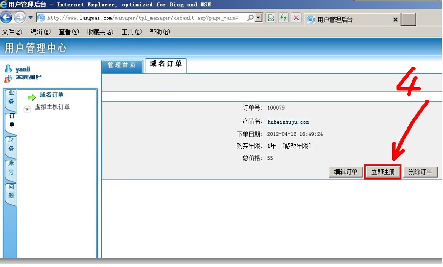 会员用户管理中心 在左侧导航 【订单】-【域名订单】-【管理】-【正式注册】